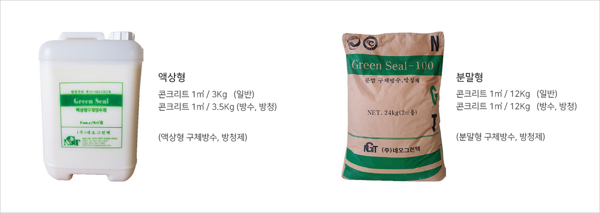 - · 분말형 구체방수 · 방청제 Green Seal 100 - 방수강도 내구성 방청 성능 향상/중성화방지/안전된 통합구조체 형성